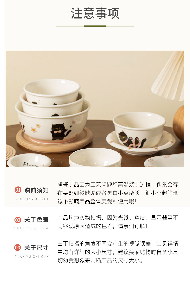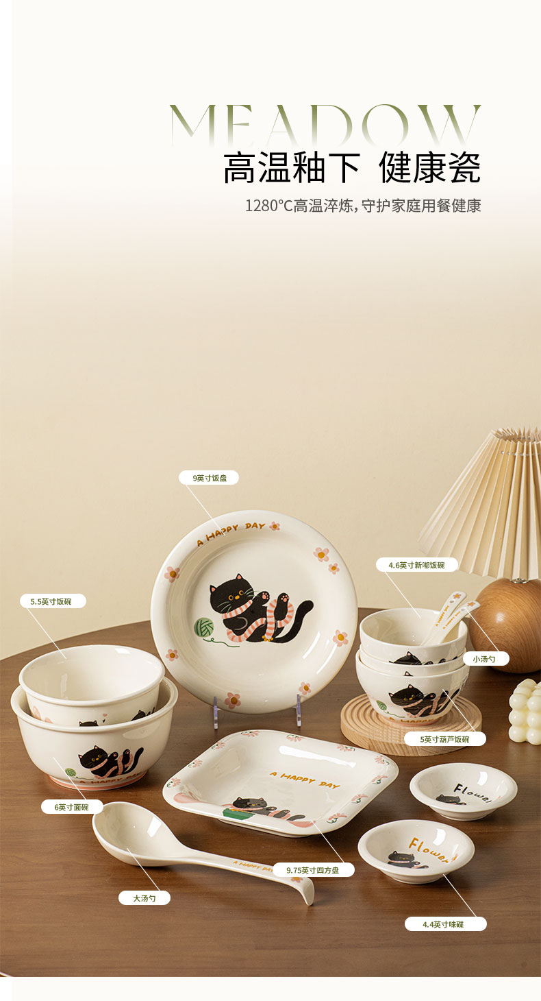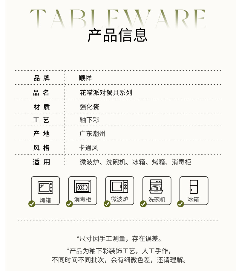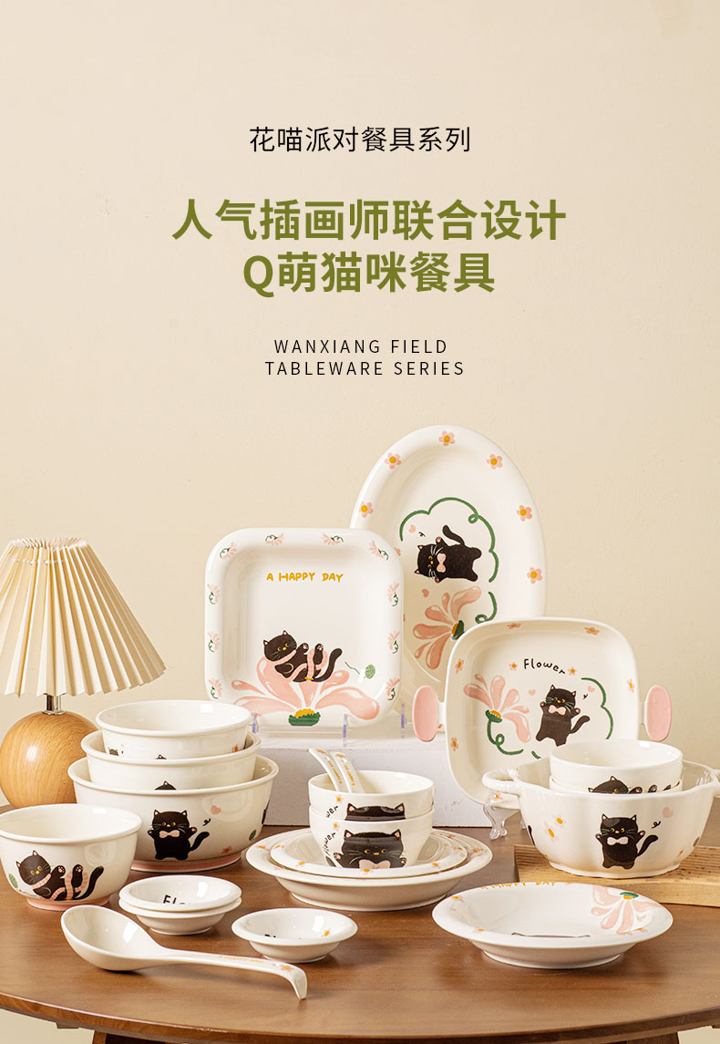 名字大全:顺祥花喵党一系列碗筷 企业:顺祥卫浴陶瓷 生产技术:釉下彩 质地:高温环境工业陶瓷 产自:国潮州 选用空间: 微波射频炉、烤箱、洗碗机等