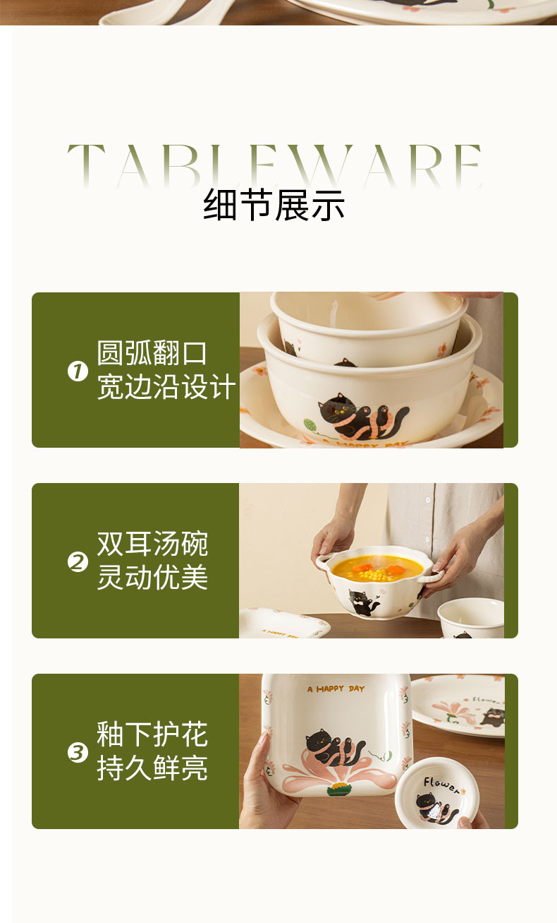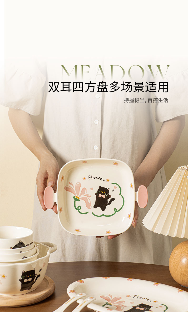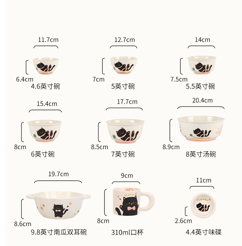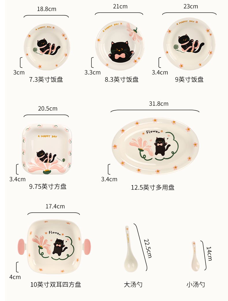 名字大全:顺祥花喵党一系列碗筷 企业:顺祥卫浴陶瓷 生产技术:釉下彩 质地:高温环境工业陶瓷 产自:国潮州 选用空间: 微波射频炉、烤箱、洗碗机等