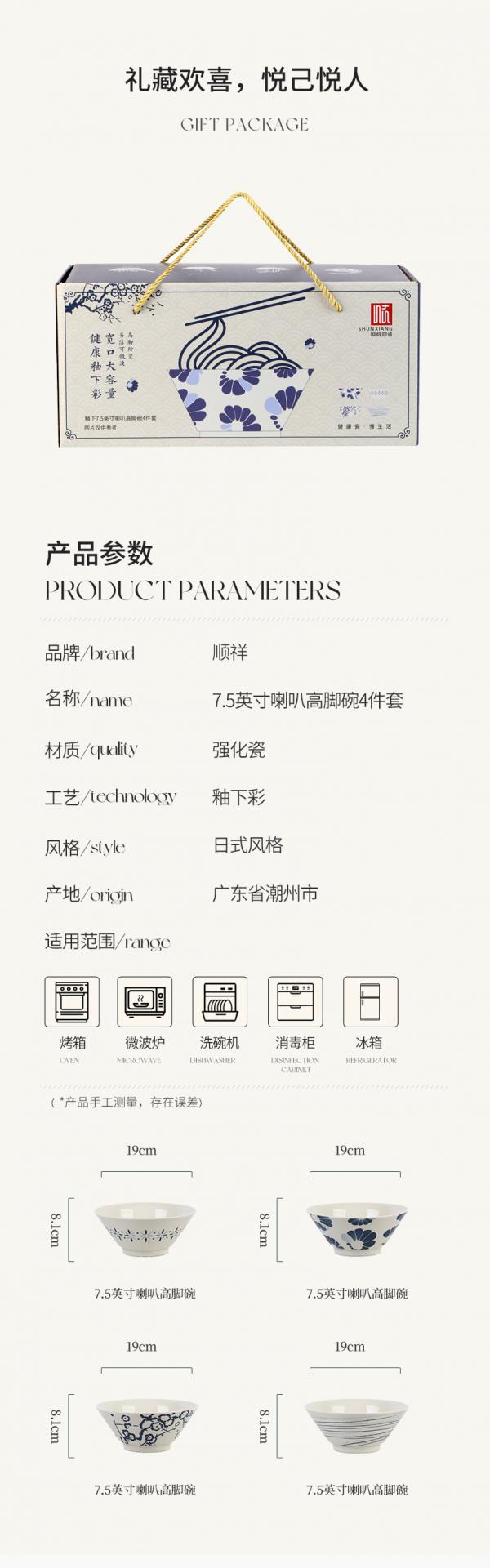 名称大全:顺祥釉下7.59英寸音箱喇叭高脚碗4件套(蓝调食器-A) 茶叶品牌:顺祥工业陶瓷 施工工艺:釉下彩 的材料:室温陶瓷图片 原产地:国内 潮州 应用范围图: 微波通信炉、烤箱、洗碗机等