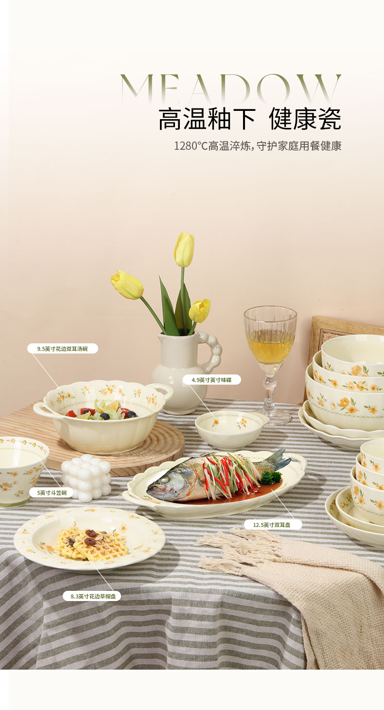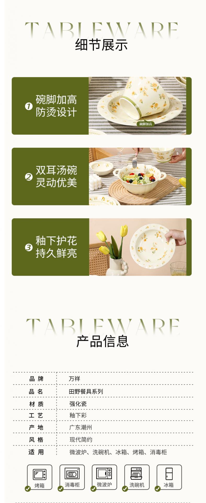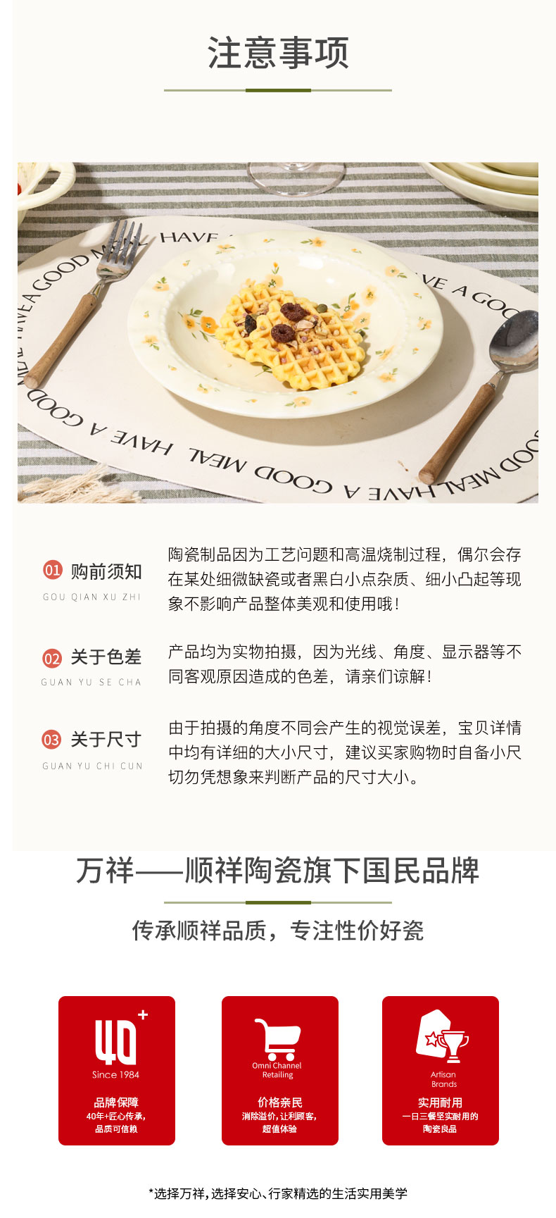 名稱:顺祥田野国产餐盘 产品品牌:顺祥瓷质 工艺设备:釉下彩 原材料:高温天气瓷质 生产基地:我国潮州 适用性的范围: 微波加热炉、烤箱、洗碗机等