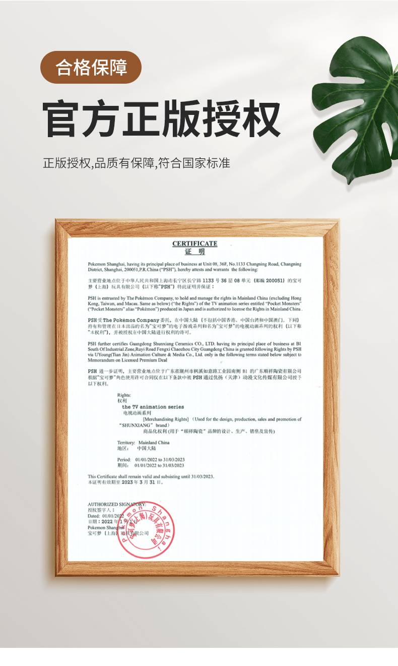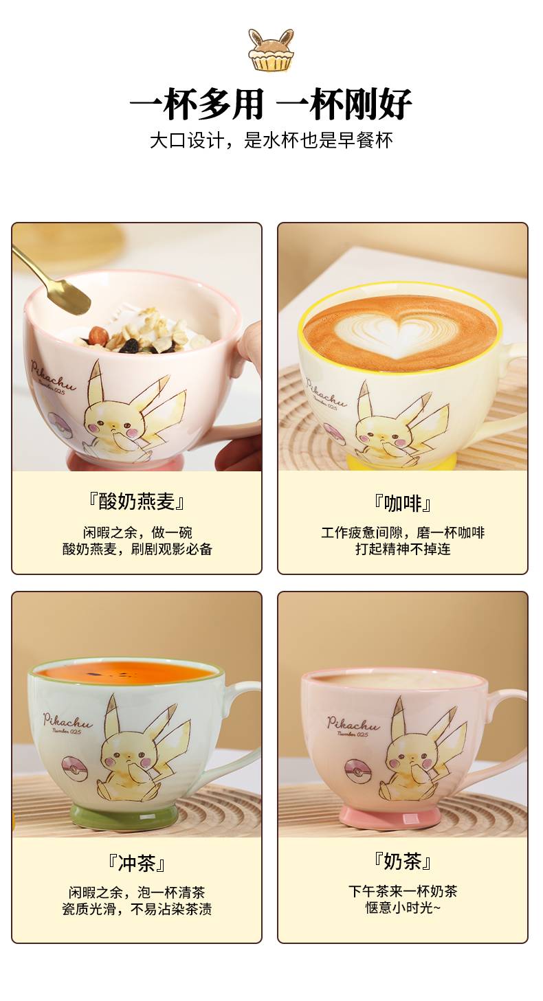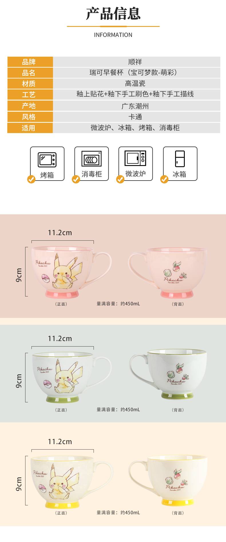 种类:顺祥宝可梦款吃早点杯 国际品牌:顺祥瓷质 施工工艺:釉上贴花+釉下描线+刷色 原材料:高的温度陶瓷制品 产自:全国潮州 适用于范围图: 红外光炉、烤箱、洗碗机等