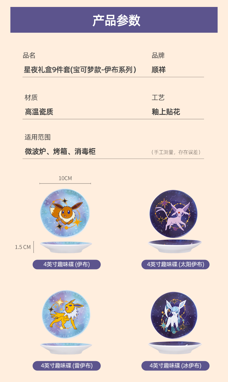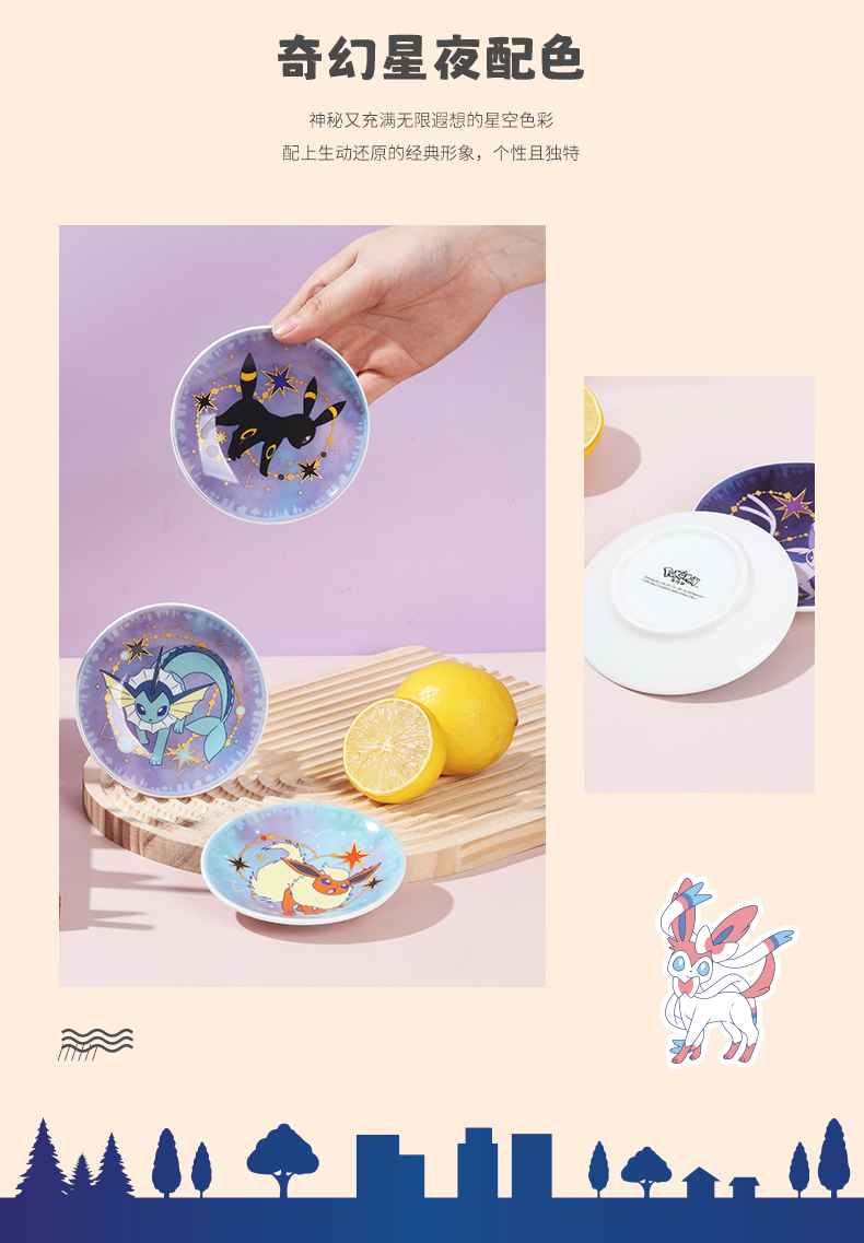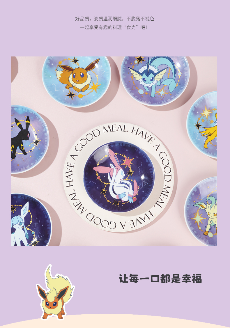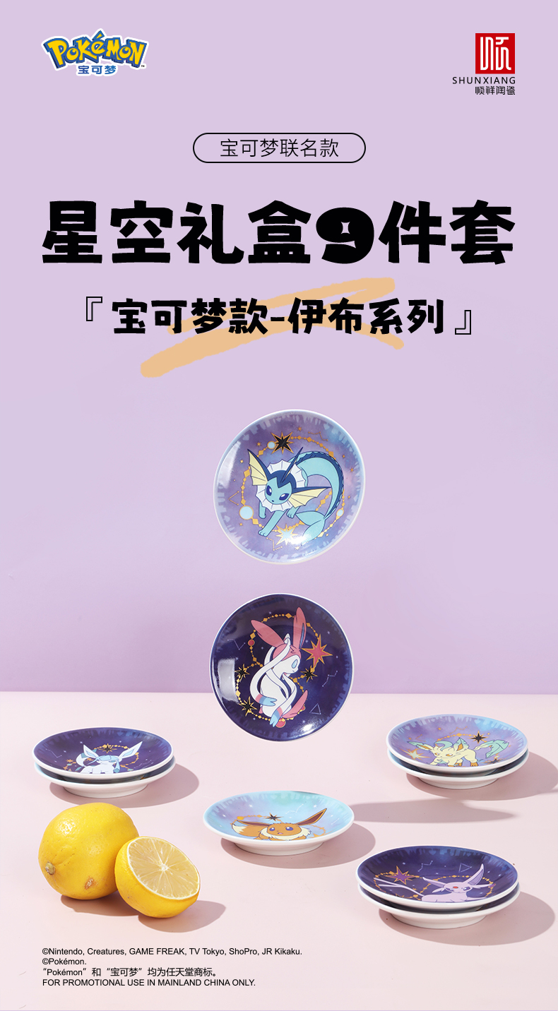 名字:顺祥宝可梦款伊布家庭星辰味碟礼箱 产品品牌:顺祥瓷砖 加工:釉上彩 才质:高溫陶瓷厂家 制造地:国内潮州 可用空间: 红外光炉、烤箱等
